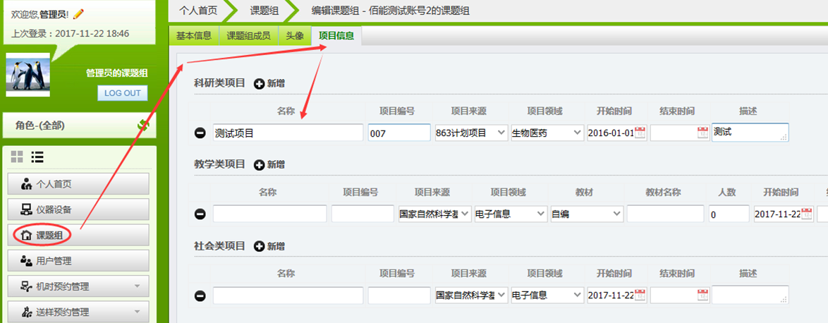 2、导师账户登录后,点击左侧菜单“课题组”,选择“项目信息”,然后填写相关的项目信息,必须写清楚真实的项目名称、项目编号、项目基金来源、项目领域、开始时间以及详细的描述