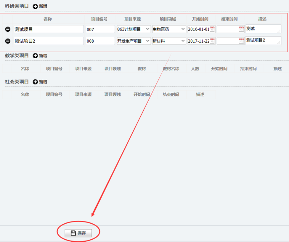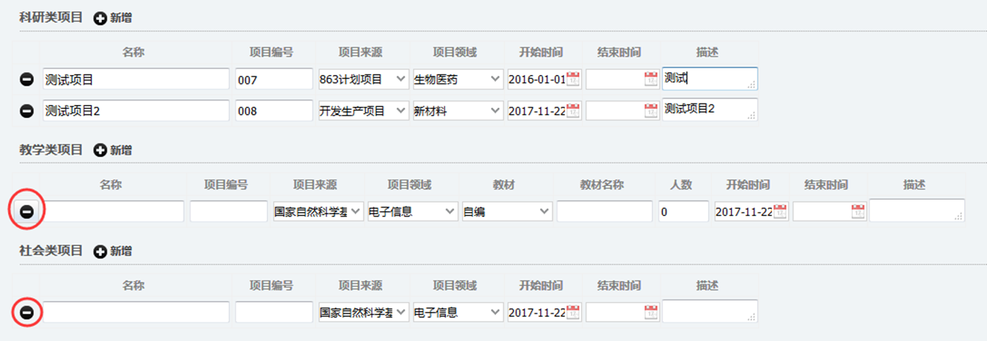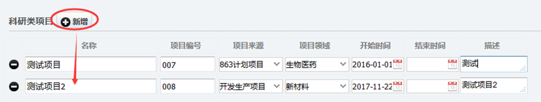 3、如果导师有多个科研类项目,可以点击科研类项目后面的新增,继续填写新的条目。