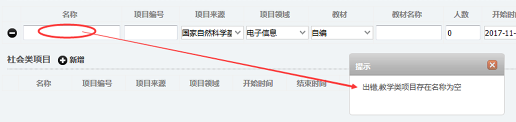 4、如果没有需要添加的教学类条目、社会类条目,请在空白条目前按“-”删掉空白条目,否则会报错,提示“出错,xx类项目存在命为空”“”